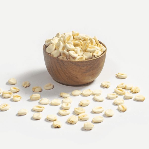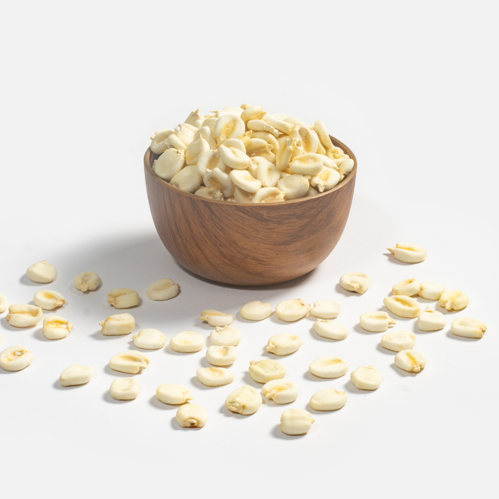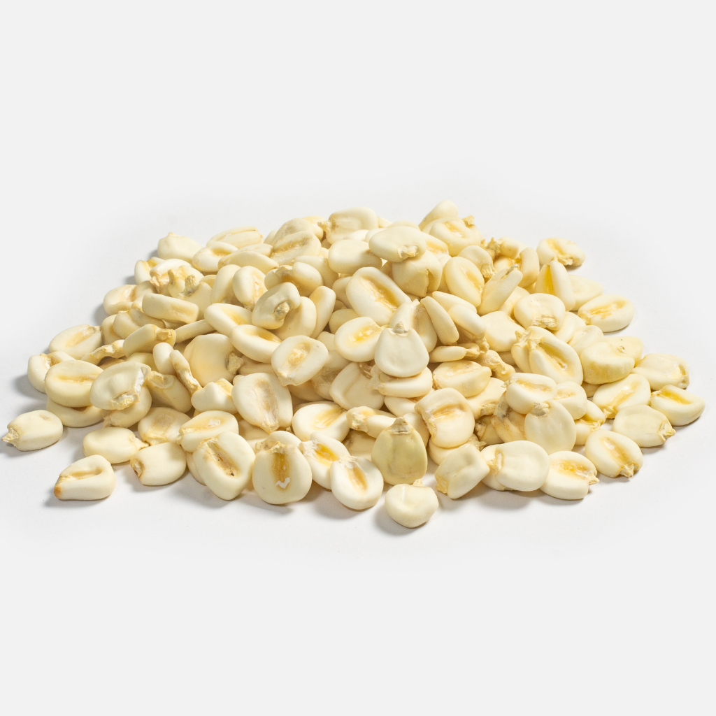 Tamaño y forma: Grano grande y alargado, sin su capa exterior (mote). Color: Blanco. Sabor: Suave y ligeramente dulce. Textura: Firme y ligeramente harinosa.